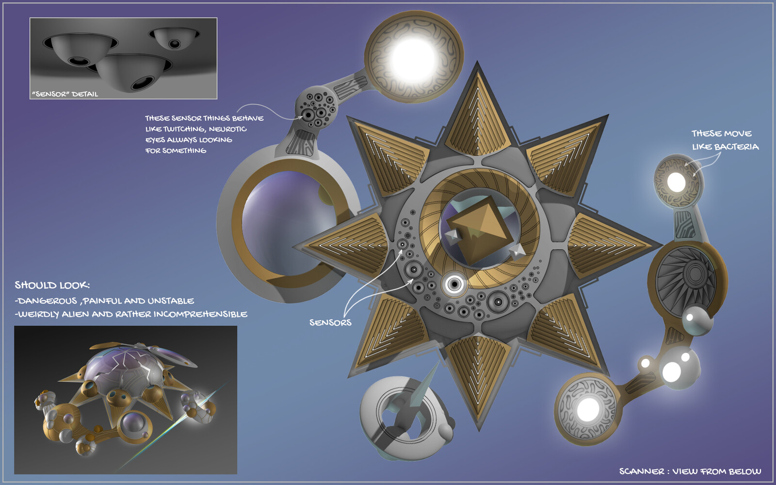 From below, the scaner would resemble the belly of a starfish, with many things unnervingly moving and twitching. A victim should feel like the scaner could kill them at any given time.