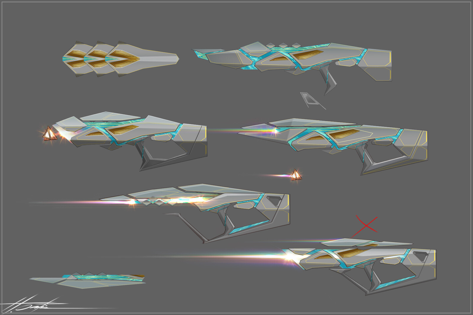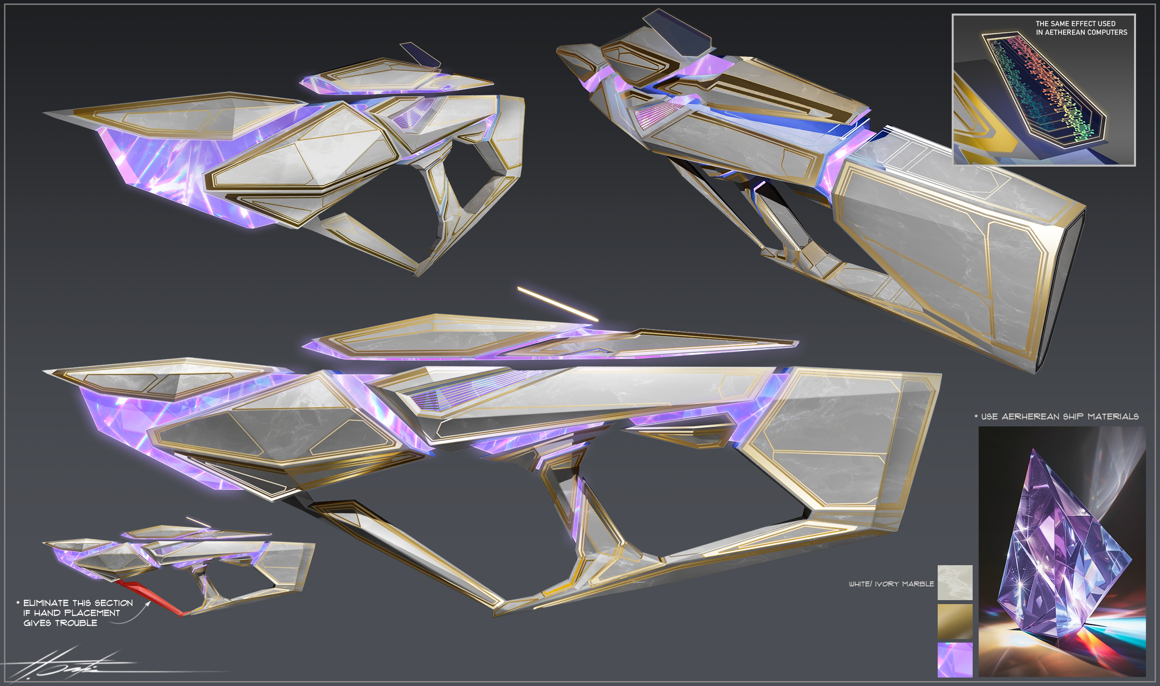 As you can tell from the sketches, it was a fun project, but at the beginning we had no clear idea of where to go. It was decided to make a bunch of sketches in different directions hoping we could land on some interesting shapes and create our weapons' looks from there. The good thing is I created this whole look (Aetherean), so I was able to extrapolate very quickly and come up with some effective designs. This is why you shouldn't rush that early concept stage. Take your time and create a solid conceptual foundation so everything gets to be future-proof. As they say, "measure twice, cut once".